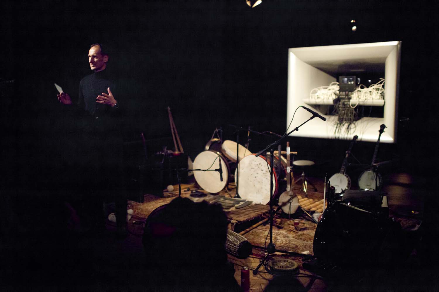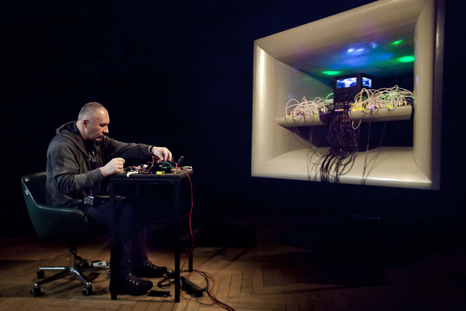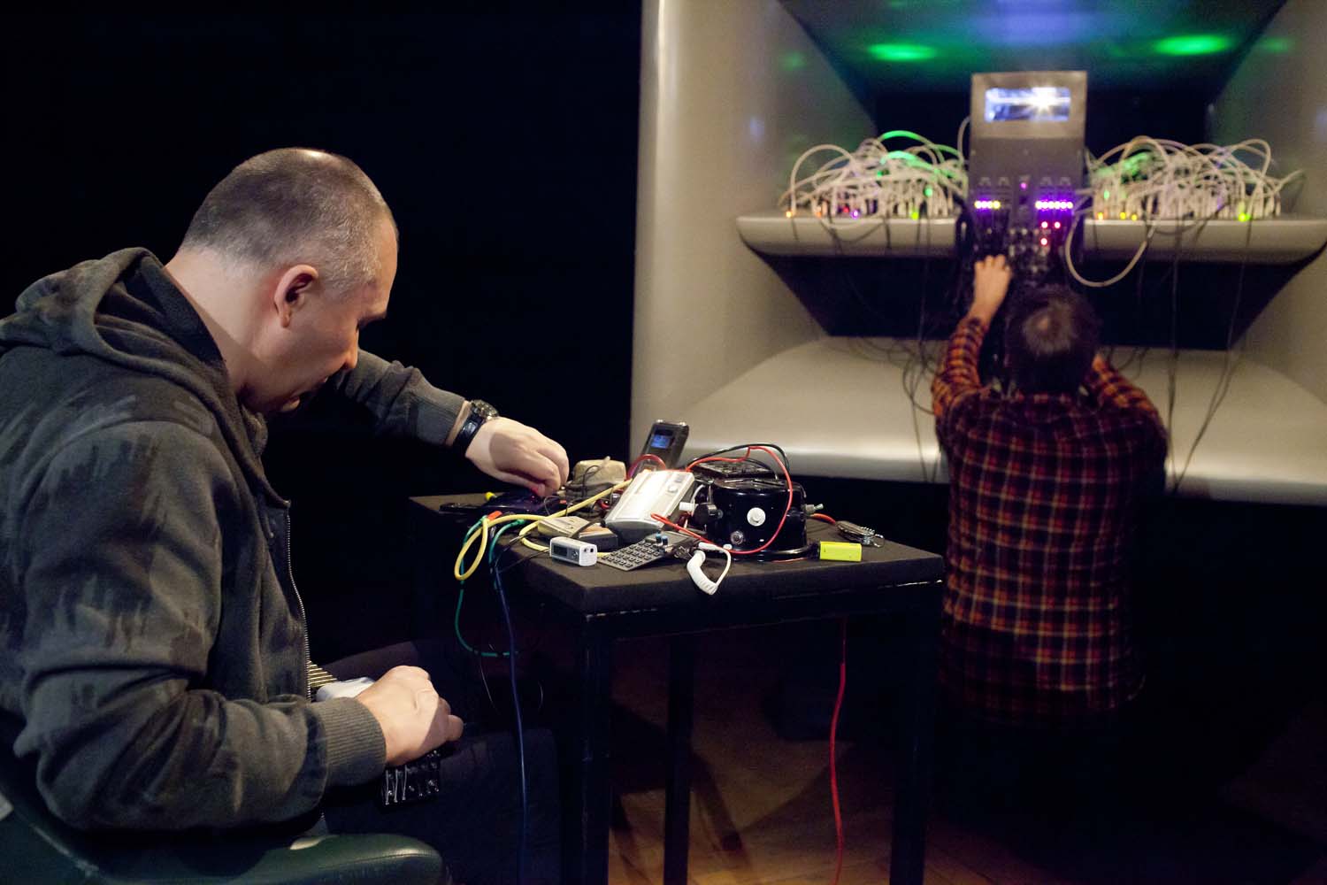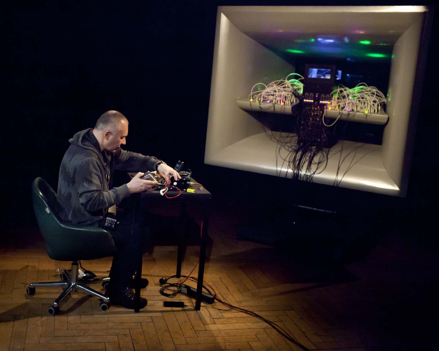 Alexei has been making music since the underground movement ignited in Russia at the beginning of the 1980’s and is one of the founding members of cult 1980’s electro-industrial pioneers Notchnoi Prospekt, a member of experimental/traditional band Volga, and a collaborator on many joint projects. He has performed at the most prominent forward-thinking music festivals (CTM Berlin, Unsound Krakow, Sonar Barcelona) and has worked with numerous adventurous musicians, such as KK Null, Jandek, Mia Zabelka and others. He’s an intense and unpredictable live performer with an audiovisual style that drives his performances to transcend the setting of an everyday gig and resemble Beckett-style theatre of the absurd.