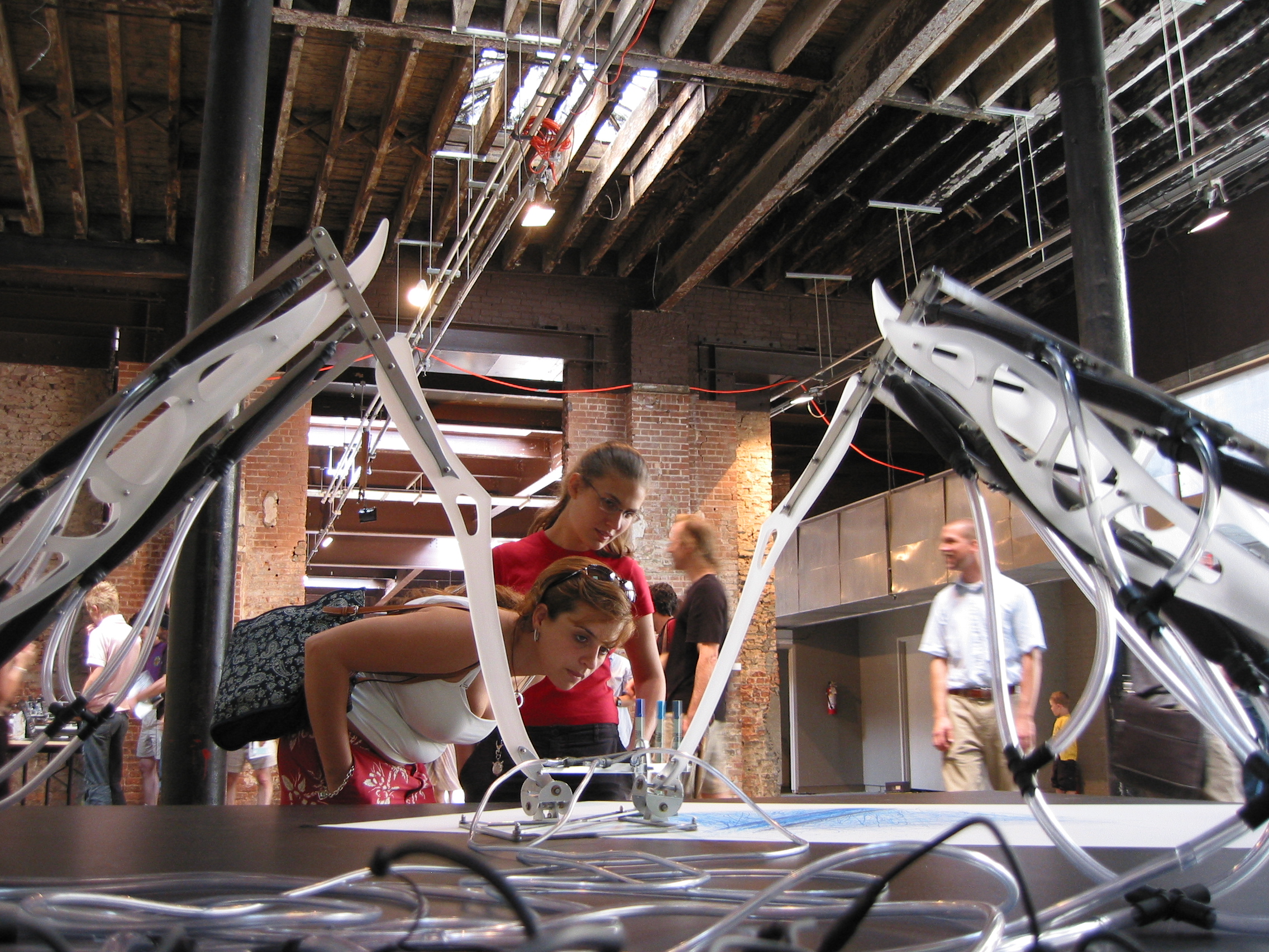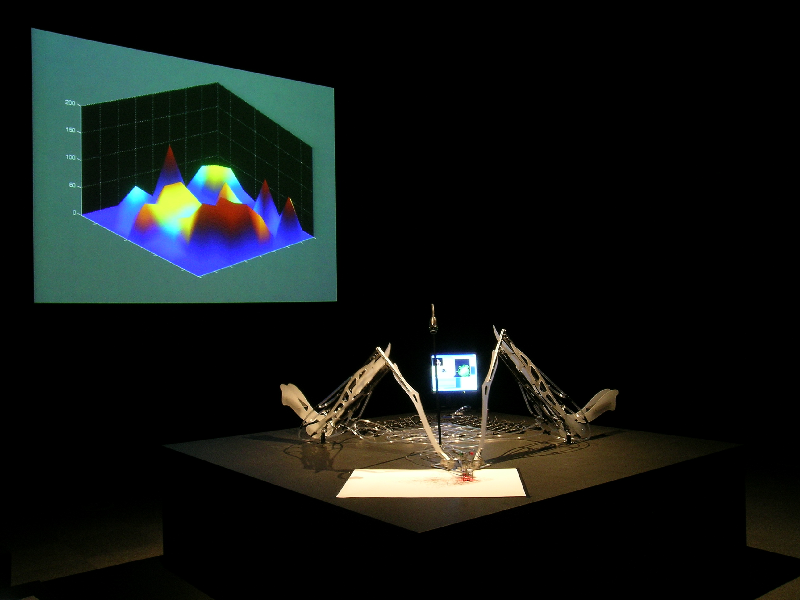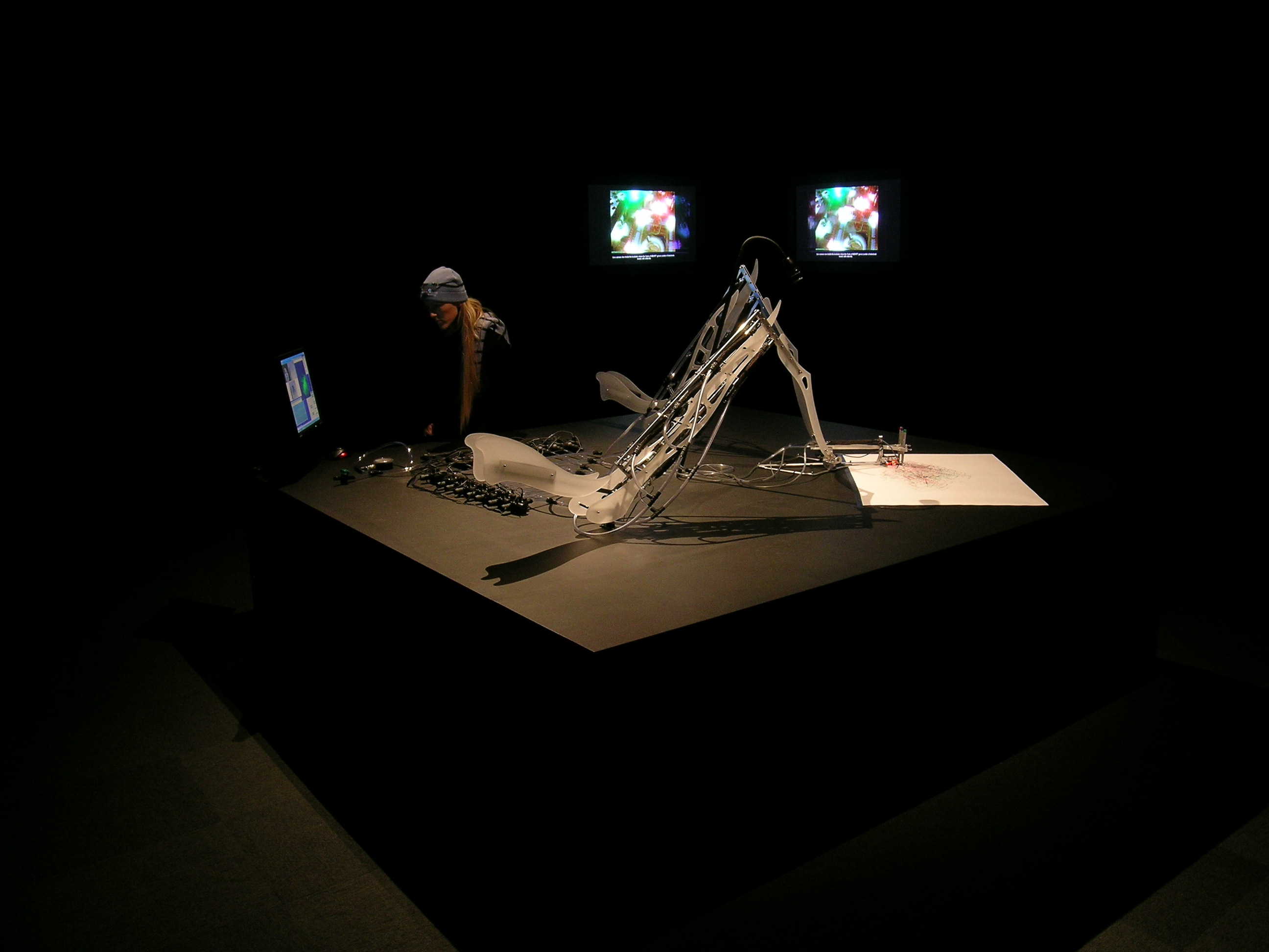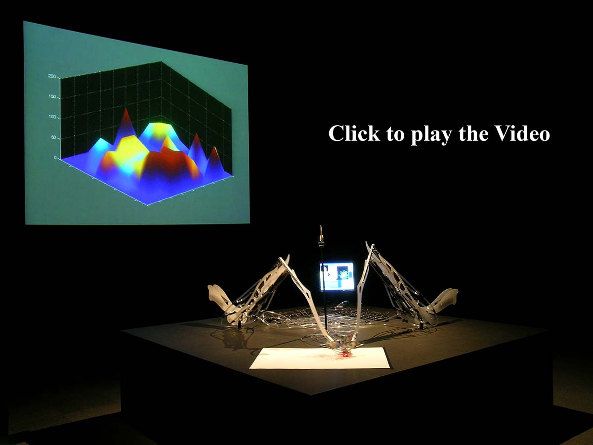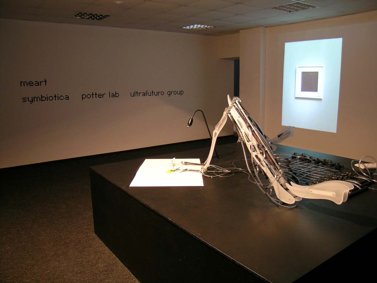 This piece traces its influences from an array of artistic, scientific and technological streams. Areas such as interactive art, cybernetics, kinetic and robotic art, artificial life/intelligence and biology are all linked to the project. Other influences are the different representations and use of animals in contemporary arts, from the use of elephants to produce “art” to the use of living and recently living animals/bodies (or parts of the body) as art works.
