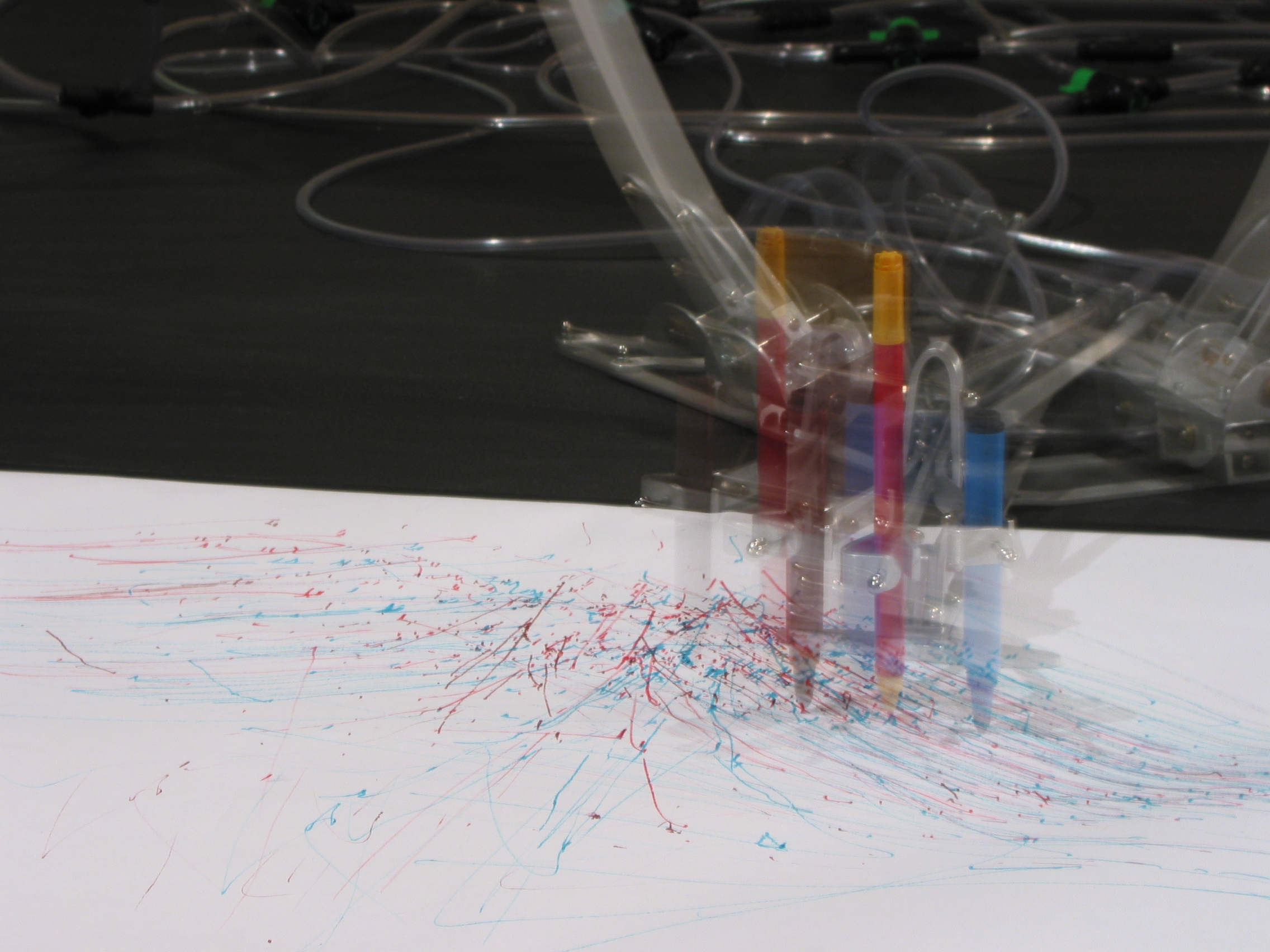 A web cam captures portraits of viewers within the gallery space. These images are then converted into a stimulation map and used to stimulate the neurons (this is the beginning of a drawing process). A multi channel electrophysiological recording from a neuronal culture (“MEARTS brain”) is performed in Potter’s lab. The resulting data sets are processed in two locations – Atlanta & the location of the arm. The processed outcome is used to control and move the drawing arm. The progress of the drawing is monitored and compared with the original portrait. The difference between the original portrait and the progressing drawing is then sent back to the lab as another stimulation map to complete the feedback loop and this whole process continues until a threshold of marks on paper is passed. This is the end of a drawing (Click here for “how it works” illustration)