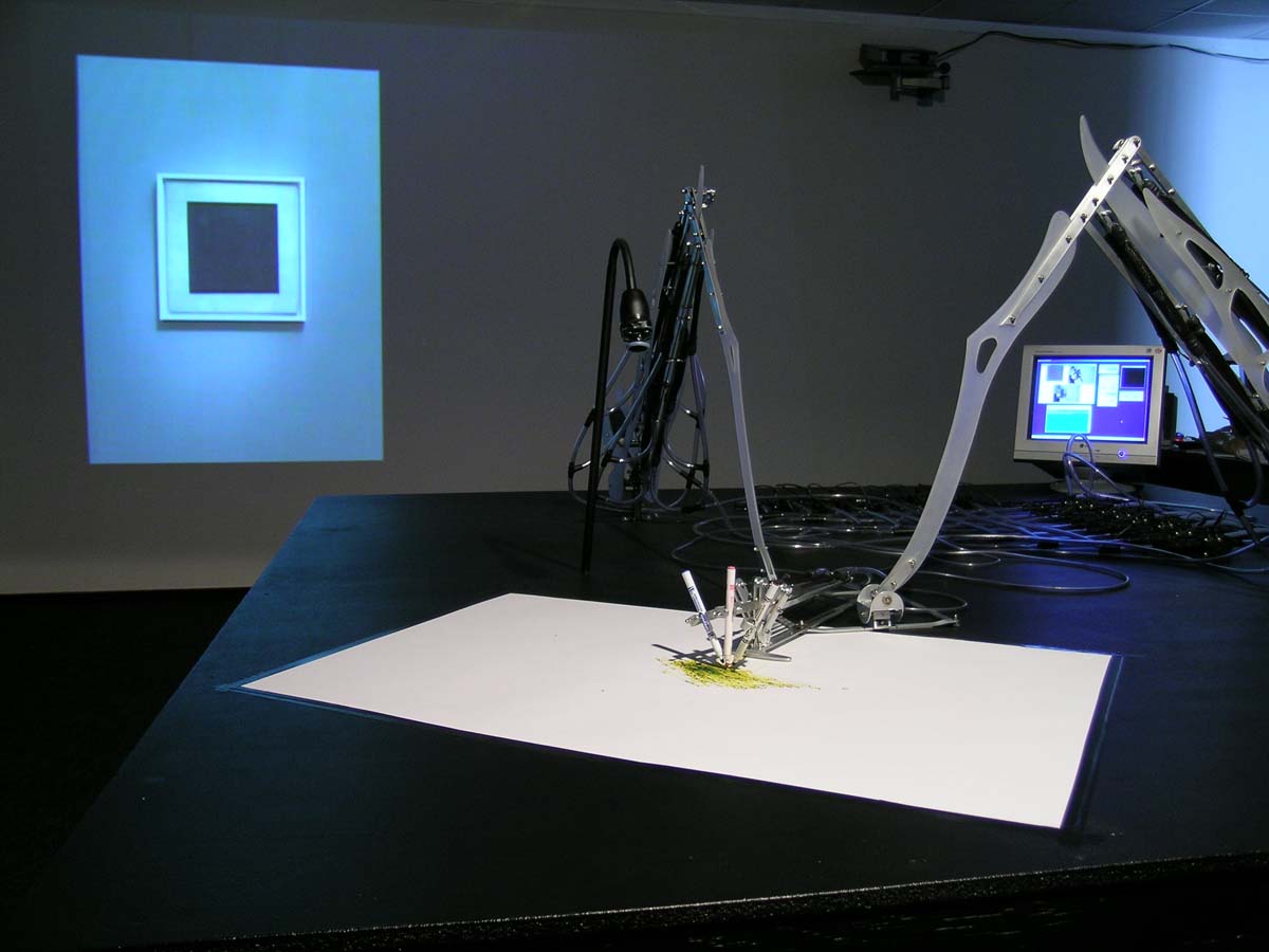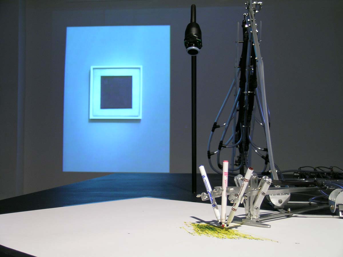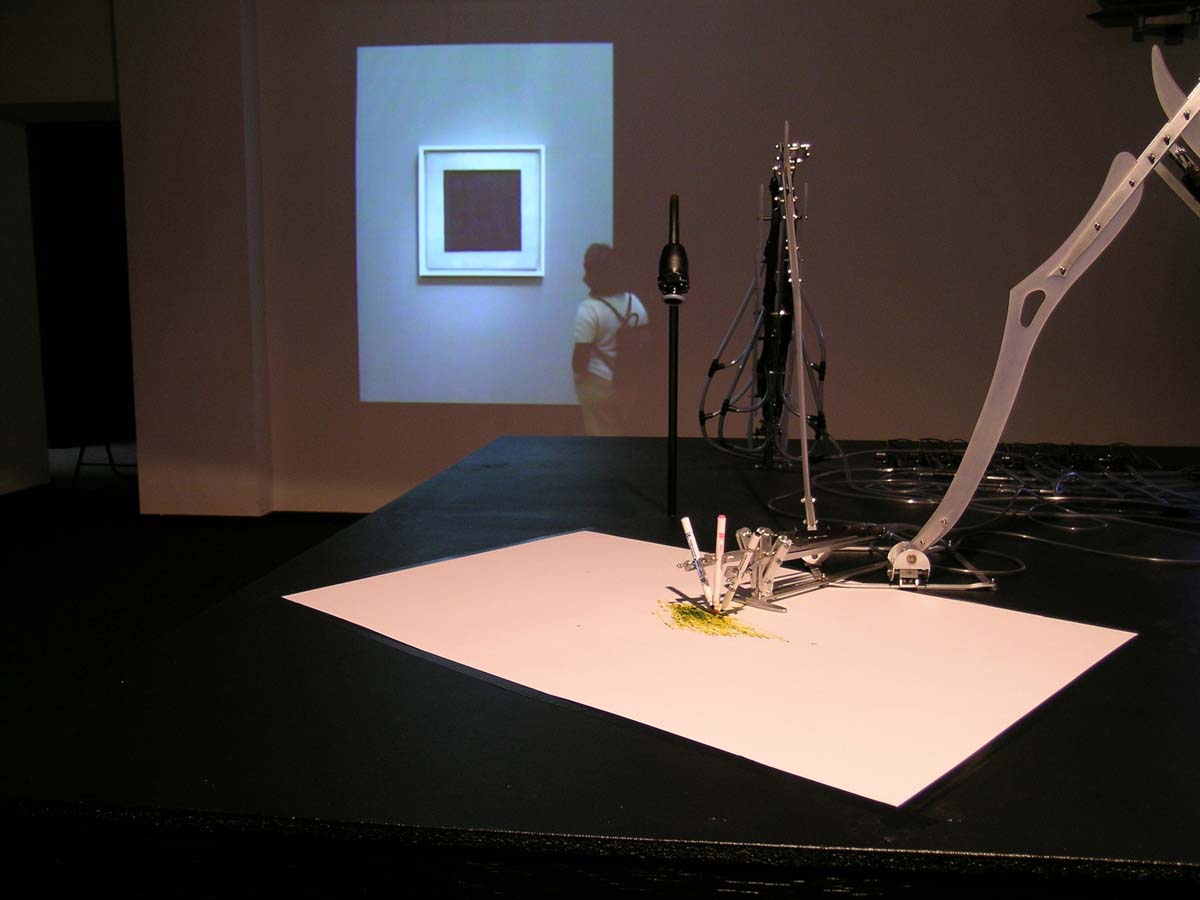 Until now MEART has been inspired by visitors to the gallery and has been drawing their portraits. In this phase (exhibited in ART Digital 2004), MEART will be drawing ‘the black square’ not only for its visual properties but also for its conceptual value.